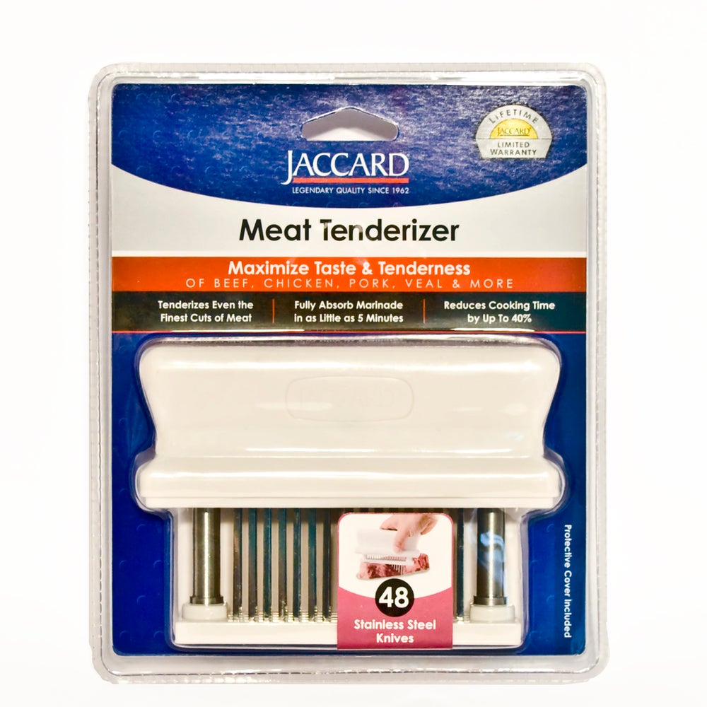 This jaccarding meat tenderizer features 48 blades, surrounded by a plastic holder. Designed to bread down tissue and create heat channels for heat and marinade penetration, the stainless steel blades are additionally shielded by an included safety holder.