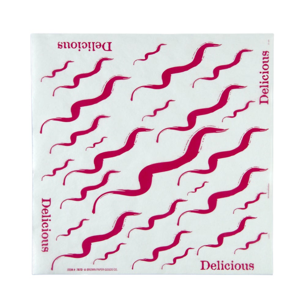 These dry waxed paper sheets feature a mauve, "Delicious" and wave design, enabling use as a sandwich wrap or basket liner.