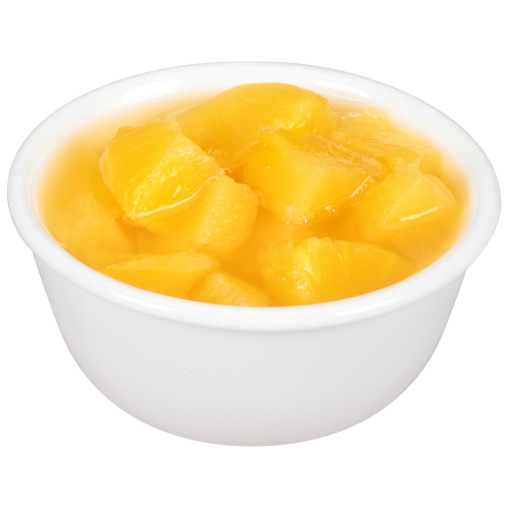 Golden pineapple is packed in an extra light syrup, highlighting the darkened yellow color and sweetened flavor of this tropical fruit.