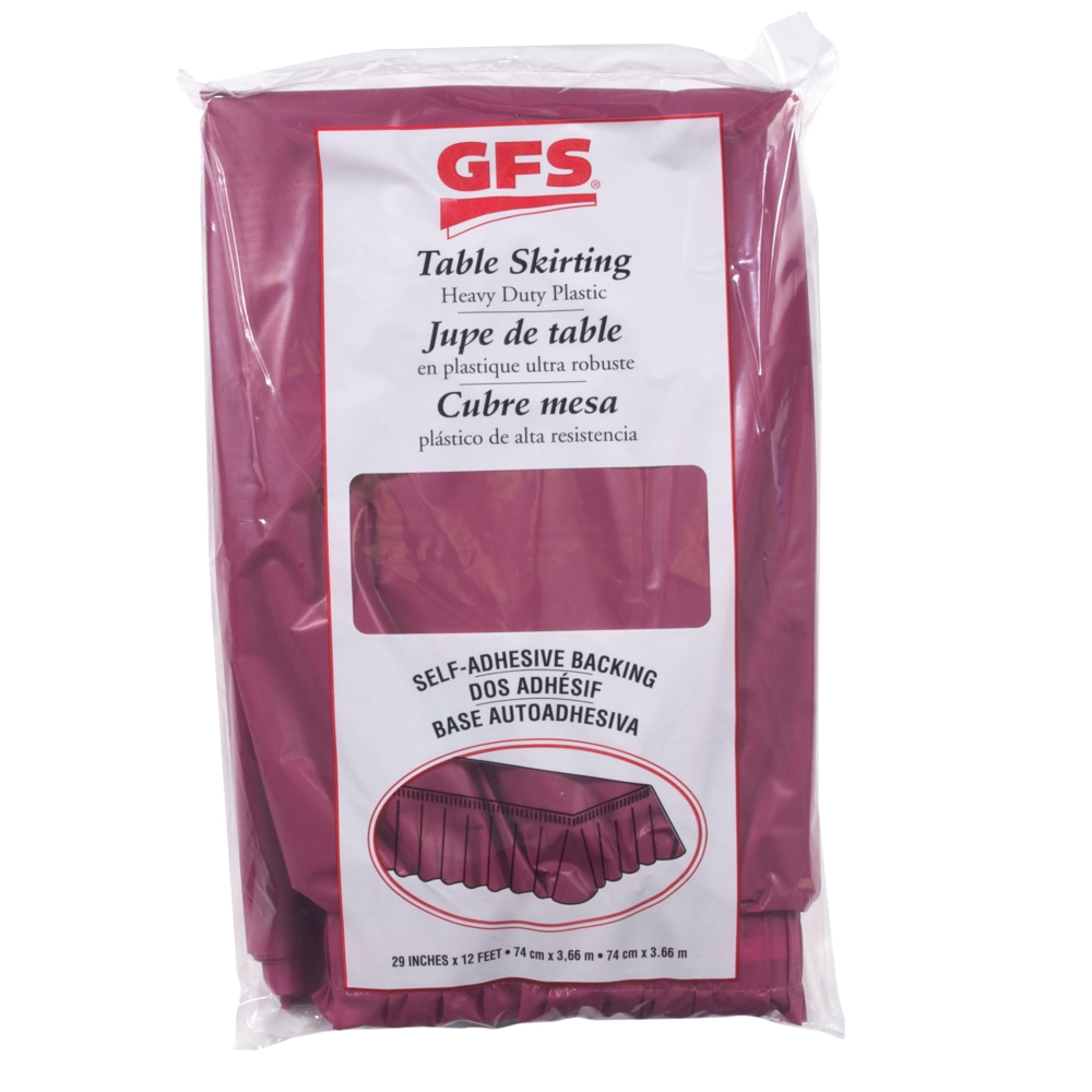 Table Skirting, 12 Foot x 29 Inch, Plastic, Burgundy, with Attached Self-Adhesive Tape