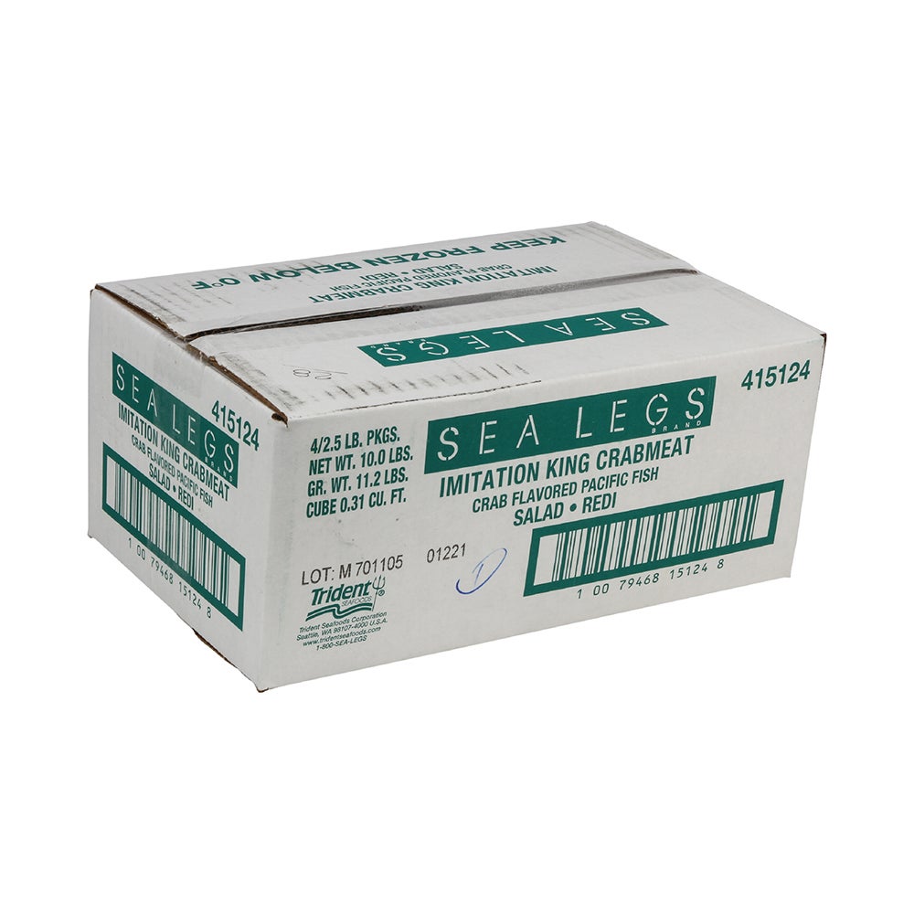 Sea Legs salad redi-style imitation crab is made from a high percentage of natural crab meat, Alaskan pollock, and all natural flavors and colors. It is an ideal combination of formed chunks and flakes to mimic the look, taste, and texture of crab leg joints and body meat, making it perfect for use as a salad topping, in pastas, or on sandwiches. This surimi may be used in both hot or cold dishes.