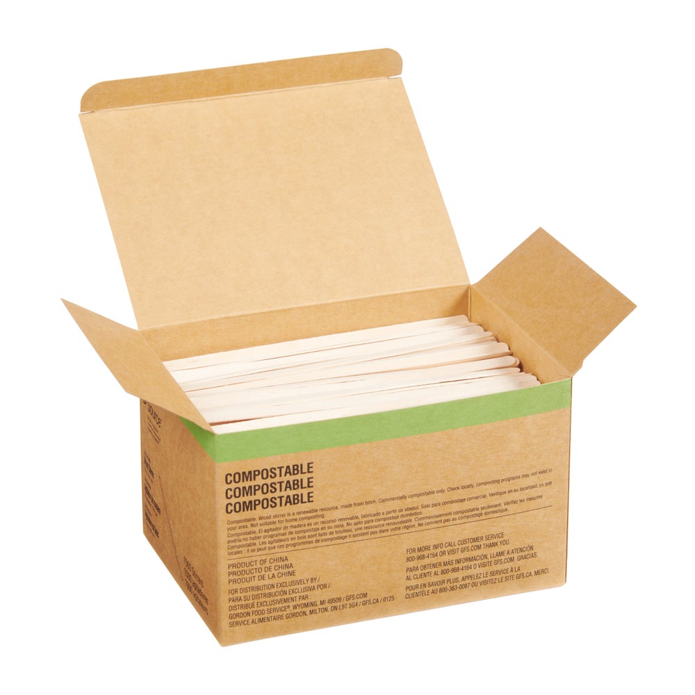 - Wood stirrer is a renewable resource, made from birch. Commercially compostable only. Check locally, composting programs may not exist in your area. Not suitable for home composting.