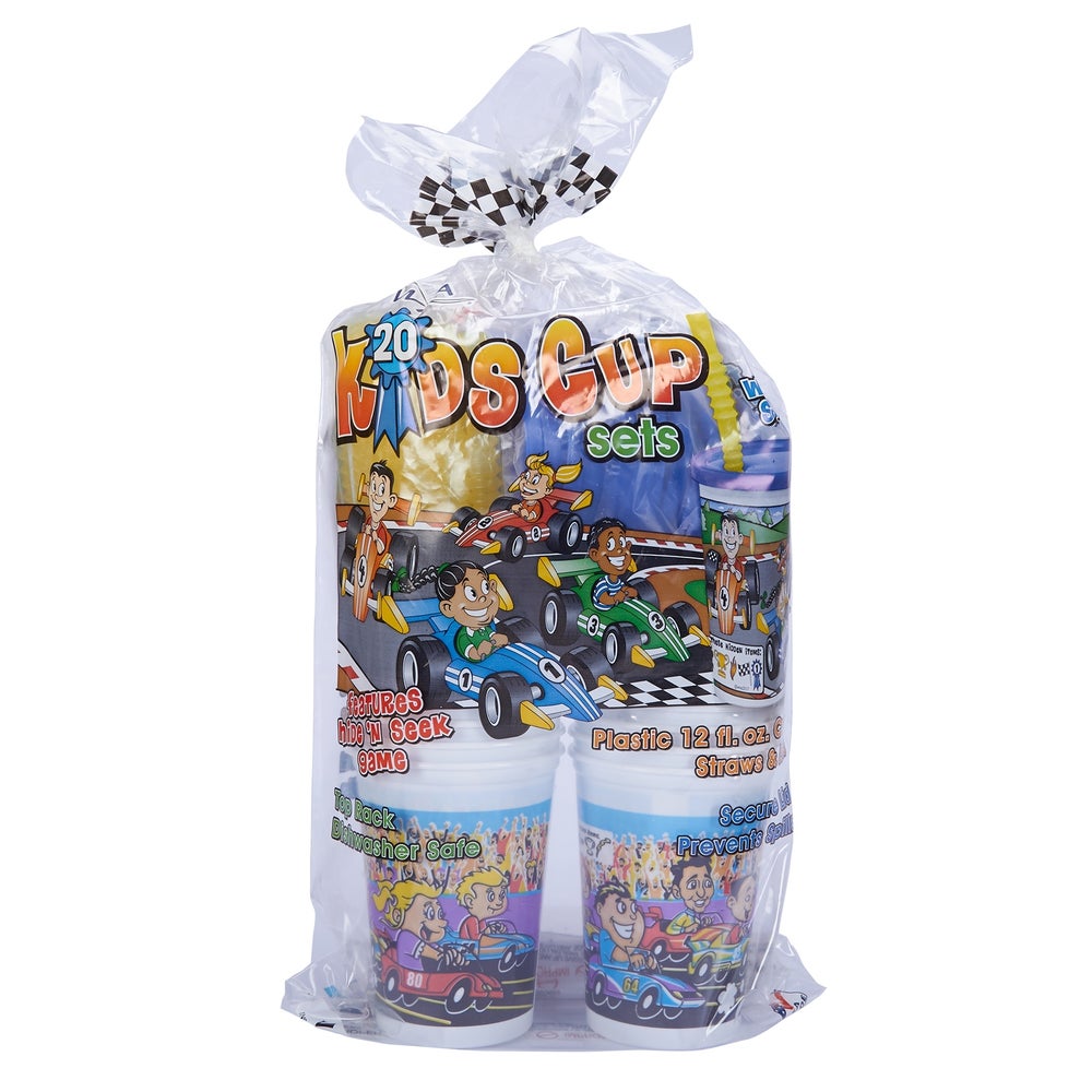 Comet 12 Ounce Plastic Kids' Cups, Racecar Design, with Lids & Straws, 20 Ct Package, 15/Case
