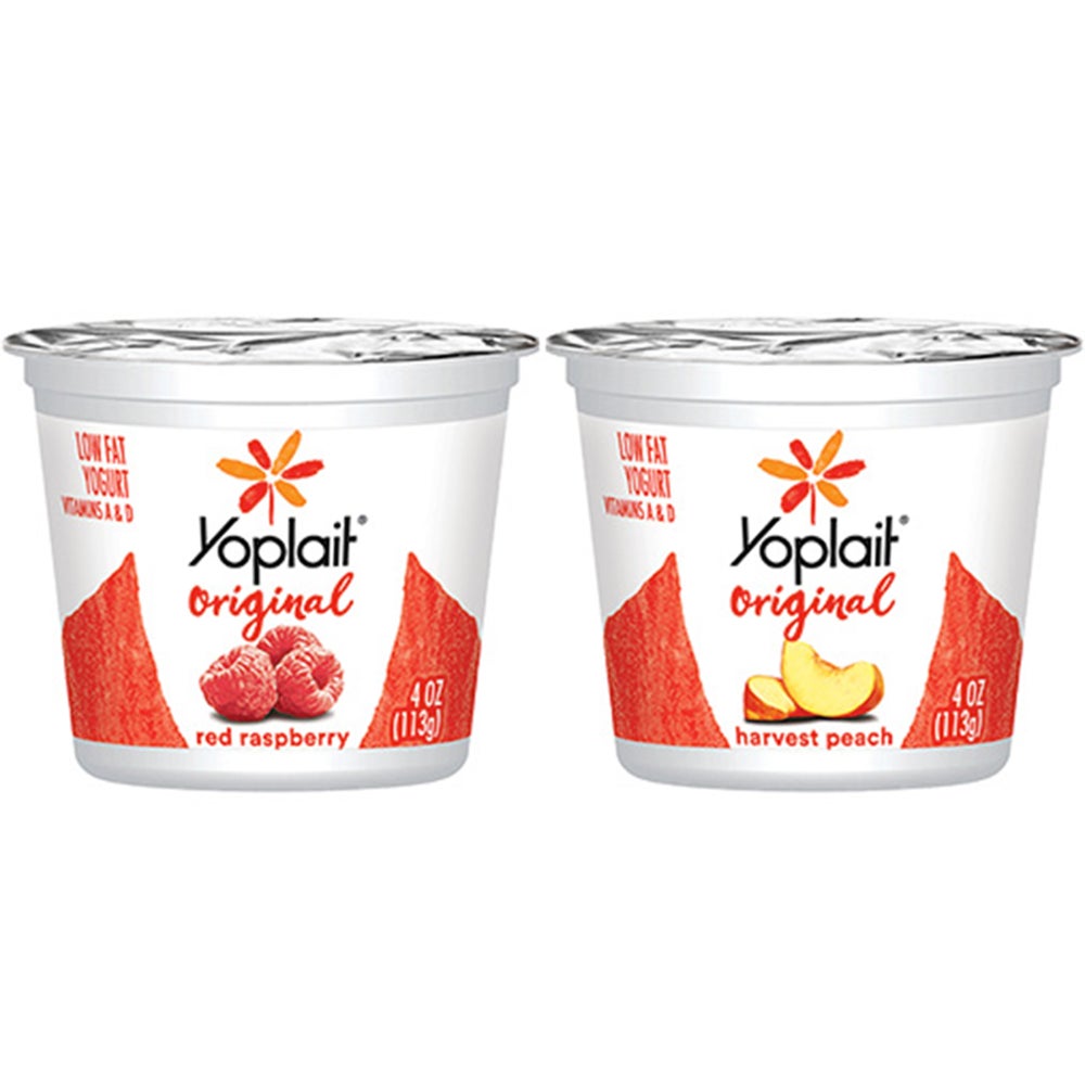 • Yoplait Original Gluten-Free Yogurt variety pack in low fat red raspberry and harvest peach flavors made with real fruit. Packaged in loose, single serve four ounce cups for quick placement or serving as part of a complete meal.