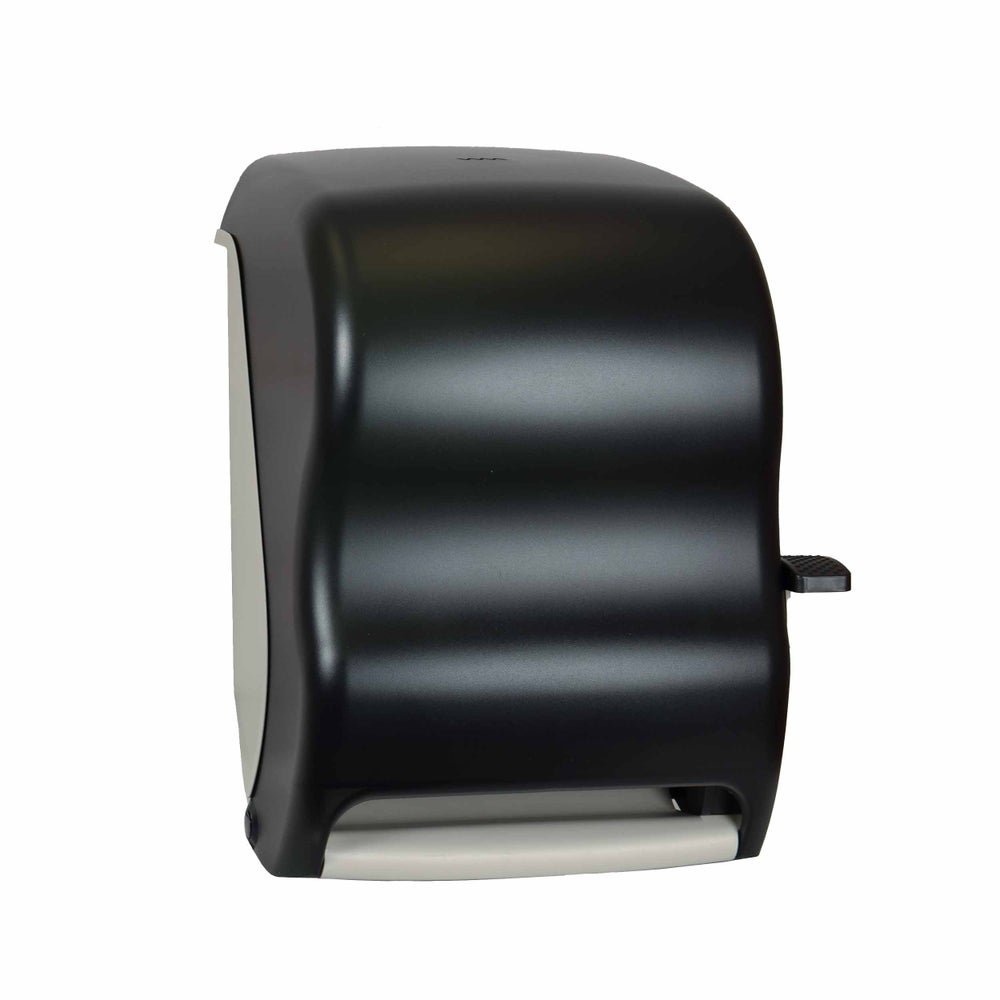 - This is a standard roll towel dispenser with lever-controlled dispensing that can be filled with any universal roll towels.