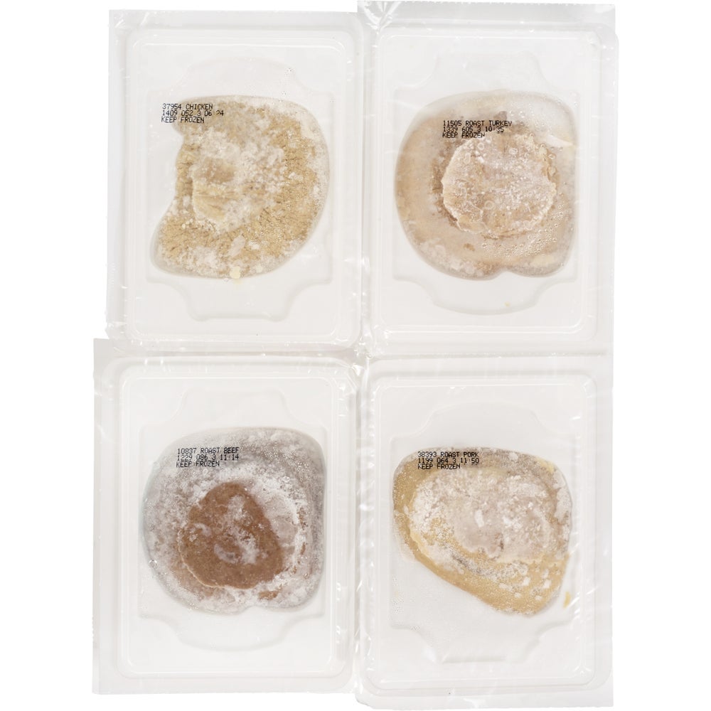 This preportioned, shaped, pureed meat assortment offers convenience, proper consistency, and ensures nutritional adequacy for modified texture diets. Each package includes six each of turkey, roast beef, pork, and chicken.