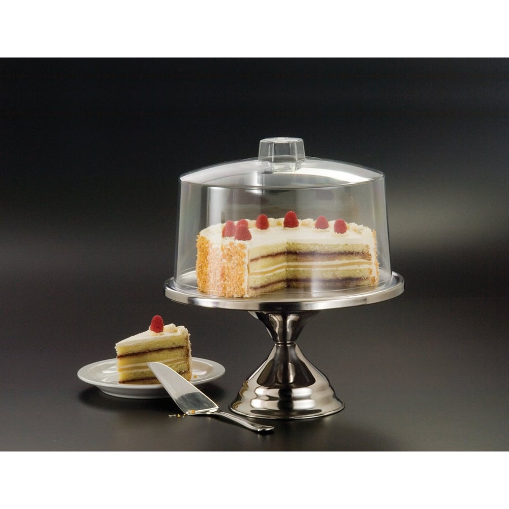 This chrome-plated pizza stand is made of durable steel construction and provides table space while elevating the pizza presentation.