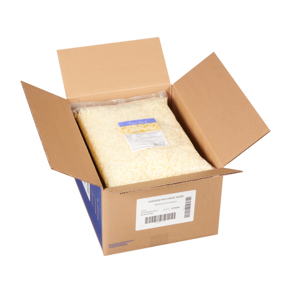 Tavolini Deluxe Cheese Blend, Mozzarella/Fontina/White Cheddar/Asiago/Romano, Feather Shredded, 5 Lb Bag, 4/Case