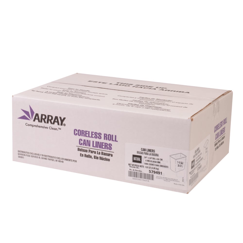 Array 7-10 Gallon Clear Can Liners, High Density, 6 Micron, 24 x 24 Inches, Food Contact Safe, 50 Ct Roll, 20/Case