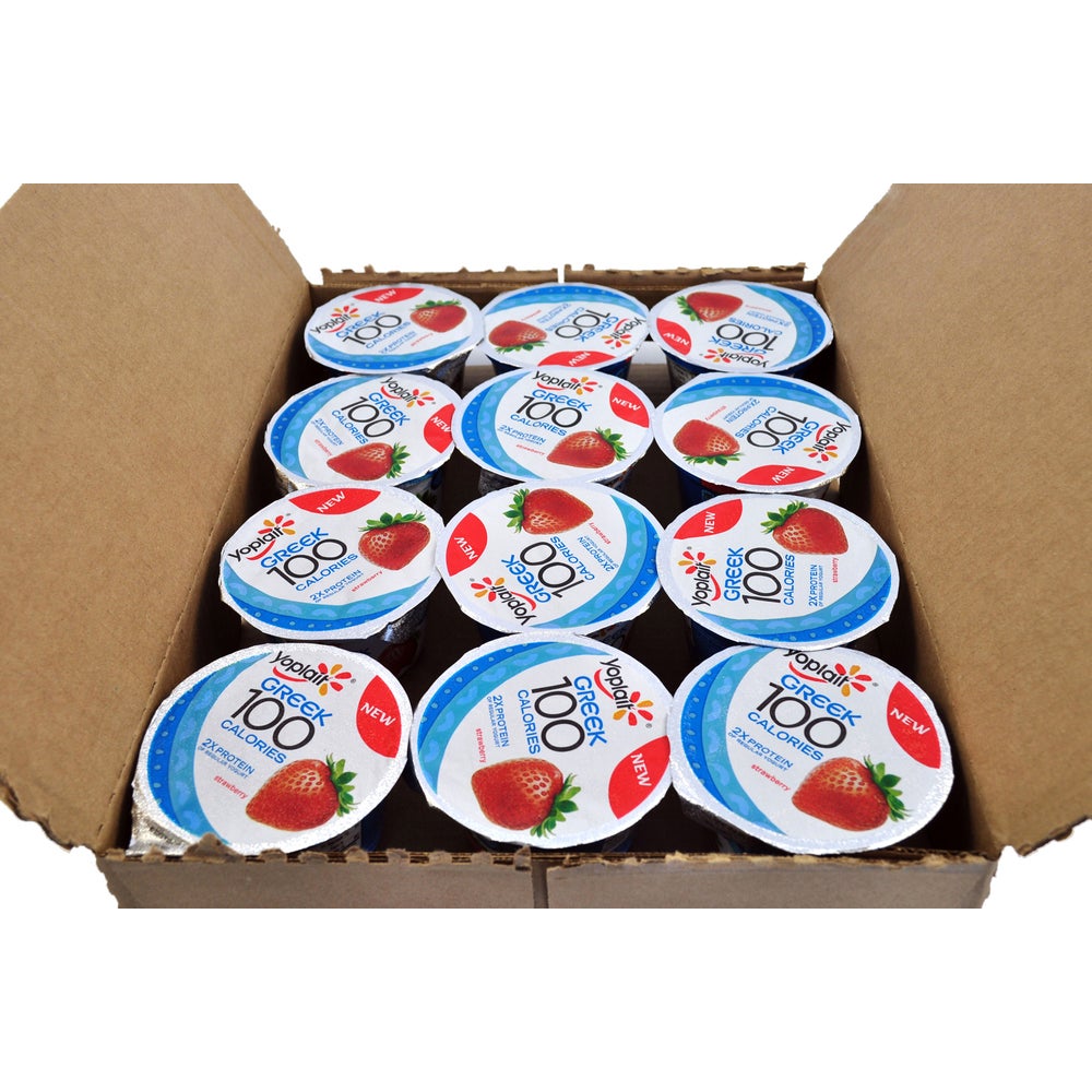 - This 100-calorie strawberry Greek yogurt cup contains thick and creamy strained yogurt with real fruit. Each cup contains 10 grams of protein, 10% of the recommended daily amount of calcium, and qualifies as a 1.25 meat alternative for education foodservice.