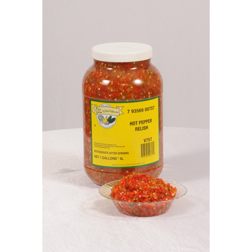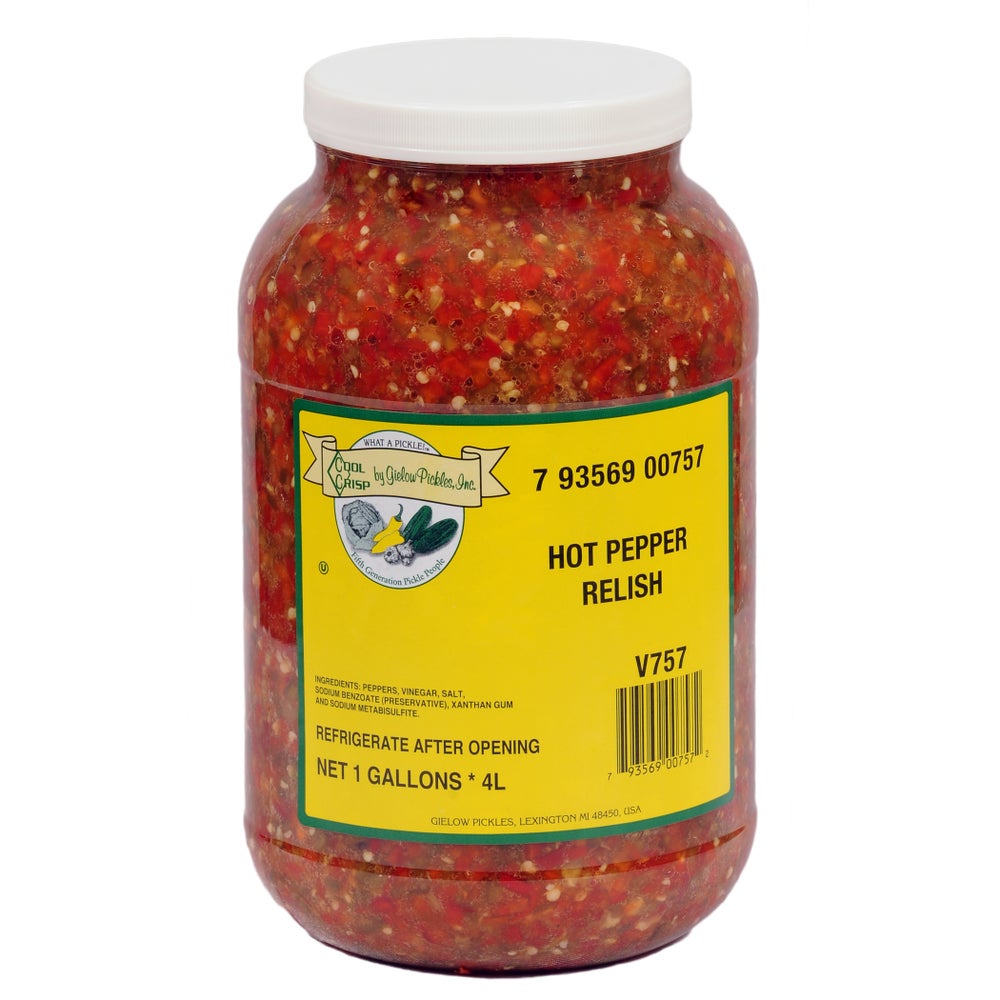 This hot pepper relish is made with a blend of peppers, making it ideal for adding heat to sandwiches or appetizers.