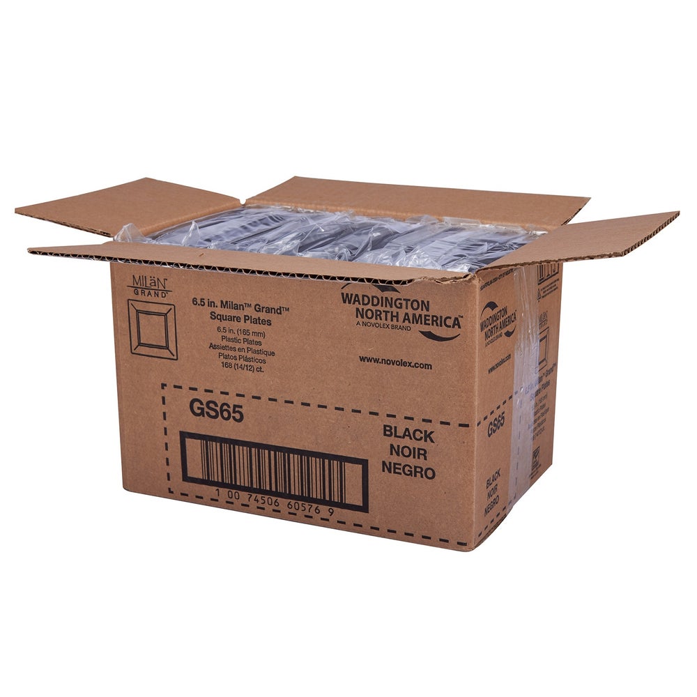 Milan 6.5 Inch Plastic Plates, Black, Square, Polystyrene, 12 Ct Package, 14/Case