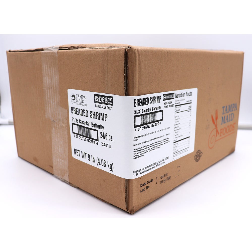 Tampa Maid Breaded Shrimp, Butterflied, Fantail, 31-35 Count per Pound, Raw, Frozen, 6 Oz Bag, 24/Case