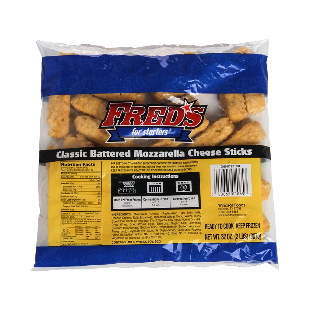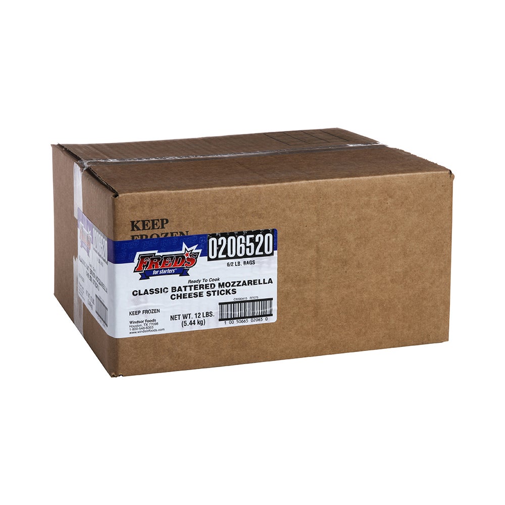 Fred's Battered Mozzarella Cheese Sticks, 2.75 Inch, IQF, 2 Lb Bag, 6/Case
