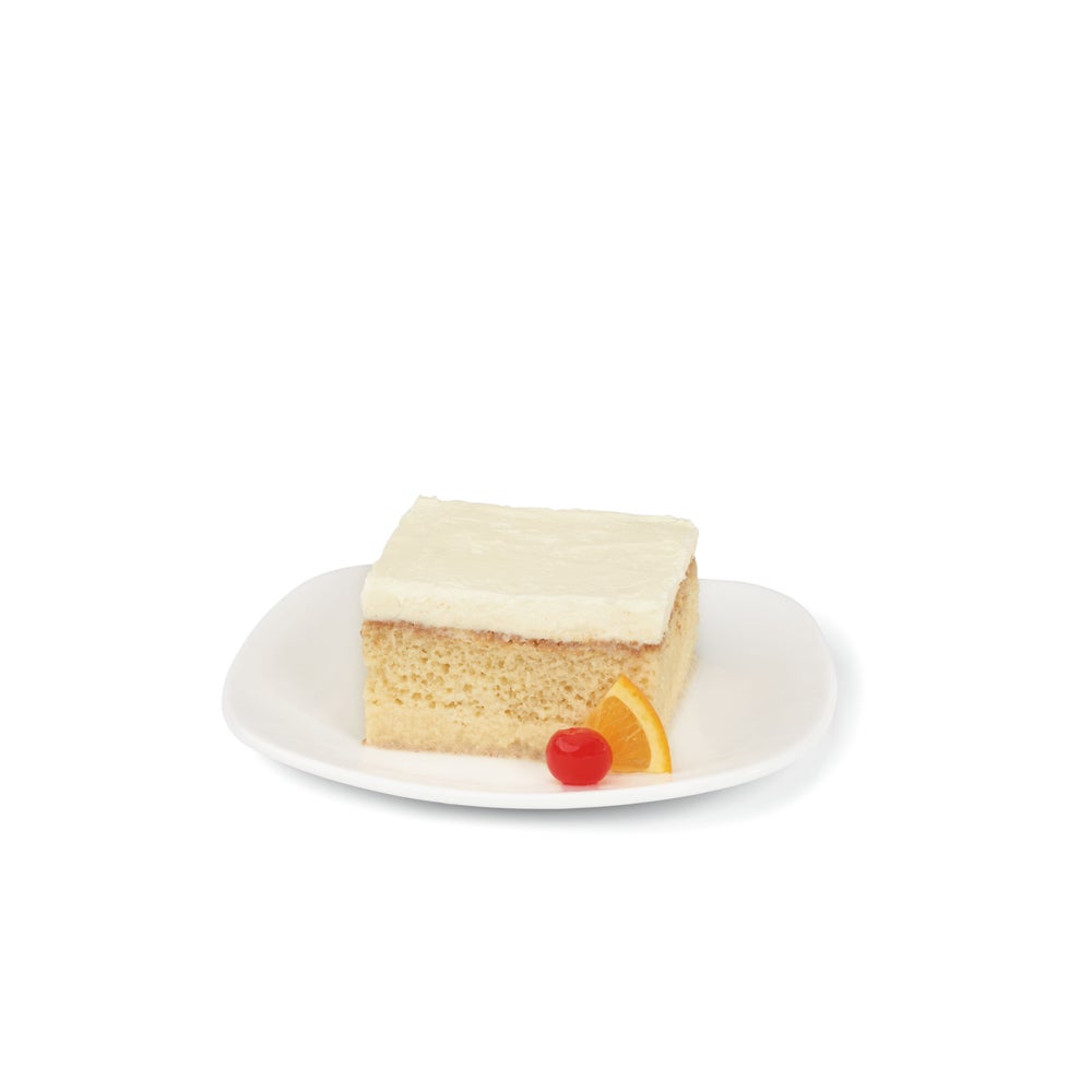 - Rich and delicious, this tres leche cake is a delicate white cake soaked with three milks (sweetened condensed, evaporated and heavy cream) and topped with fluffy vanilla whipped cream.