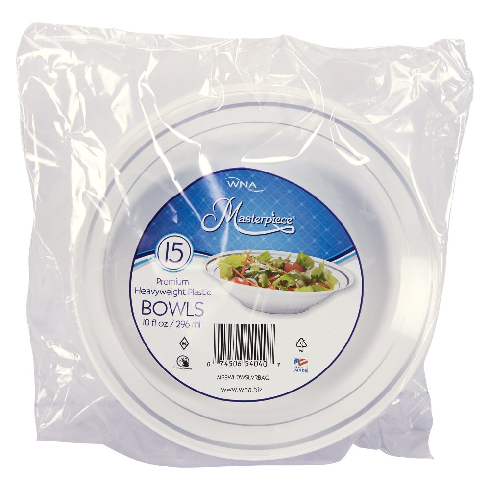 Masterpiece 10 Ounce Plastic Bowls, White with Silver Trim, Polystyrene, 15 Ct Bag, 10/Case