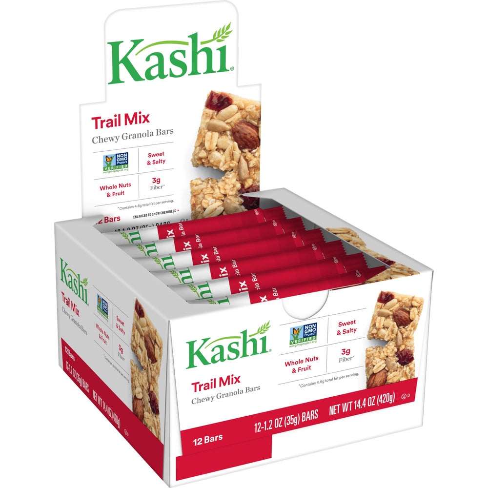 - Available in a retail carton, sweet and salty Kashi Trail Mix Bars are vegan, provide a good source of fiber, and are Non GMO Project Verified.