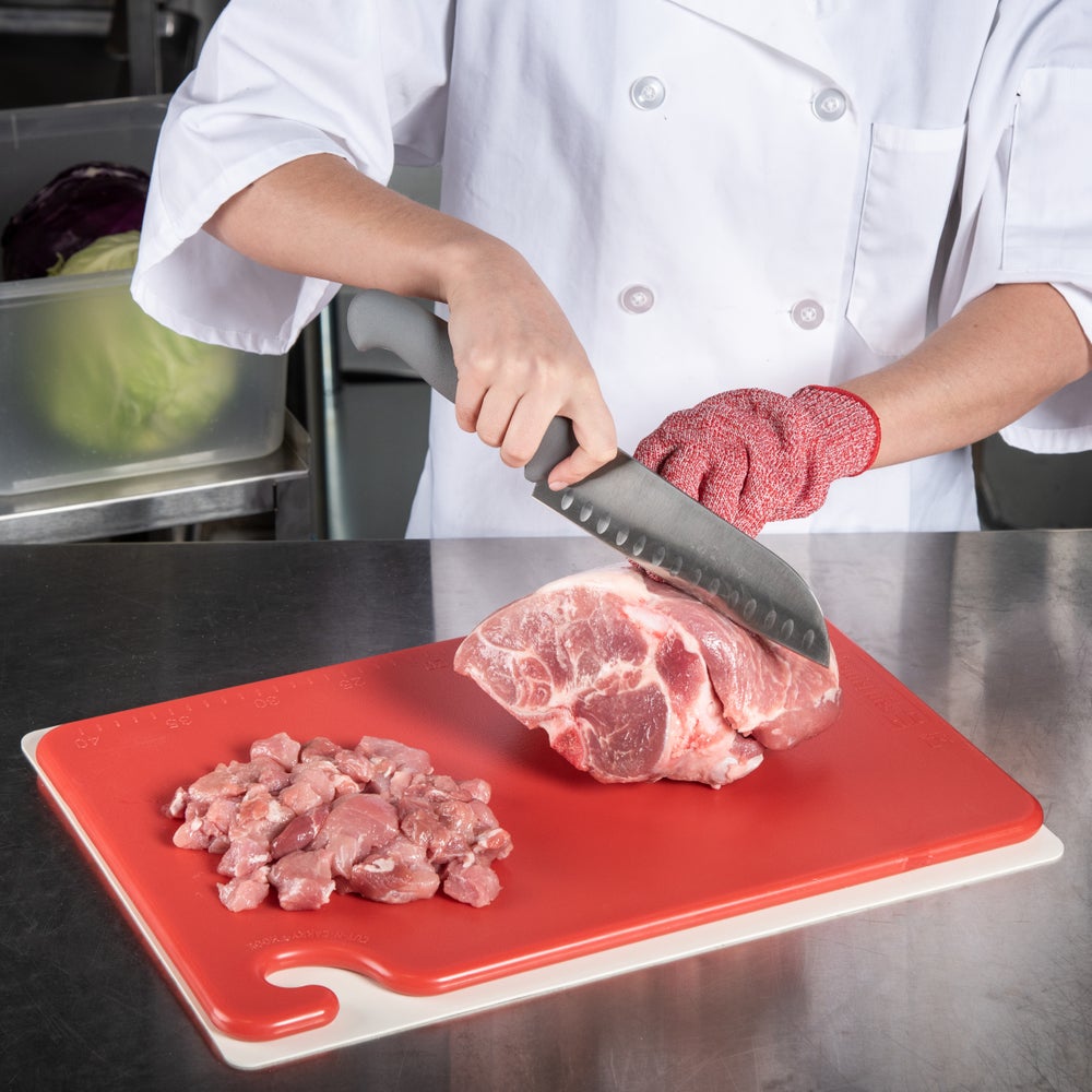 These co-polymer cutting boards feature a patented food safety hook, while the assorted color options allow for color-coding which minimized cross-contamination during food preparation. Each board resists unsanitary cut-grooving.