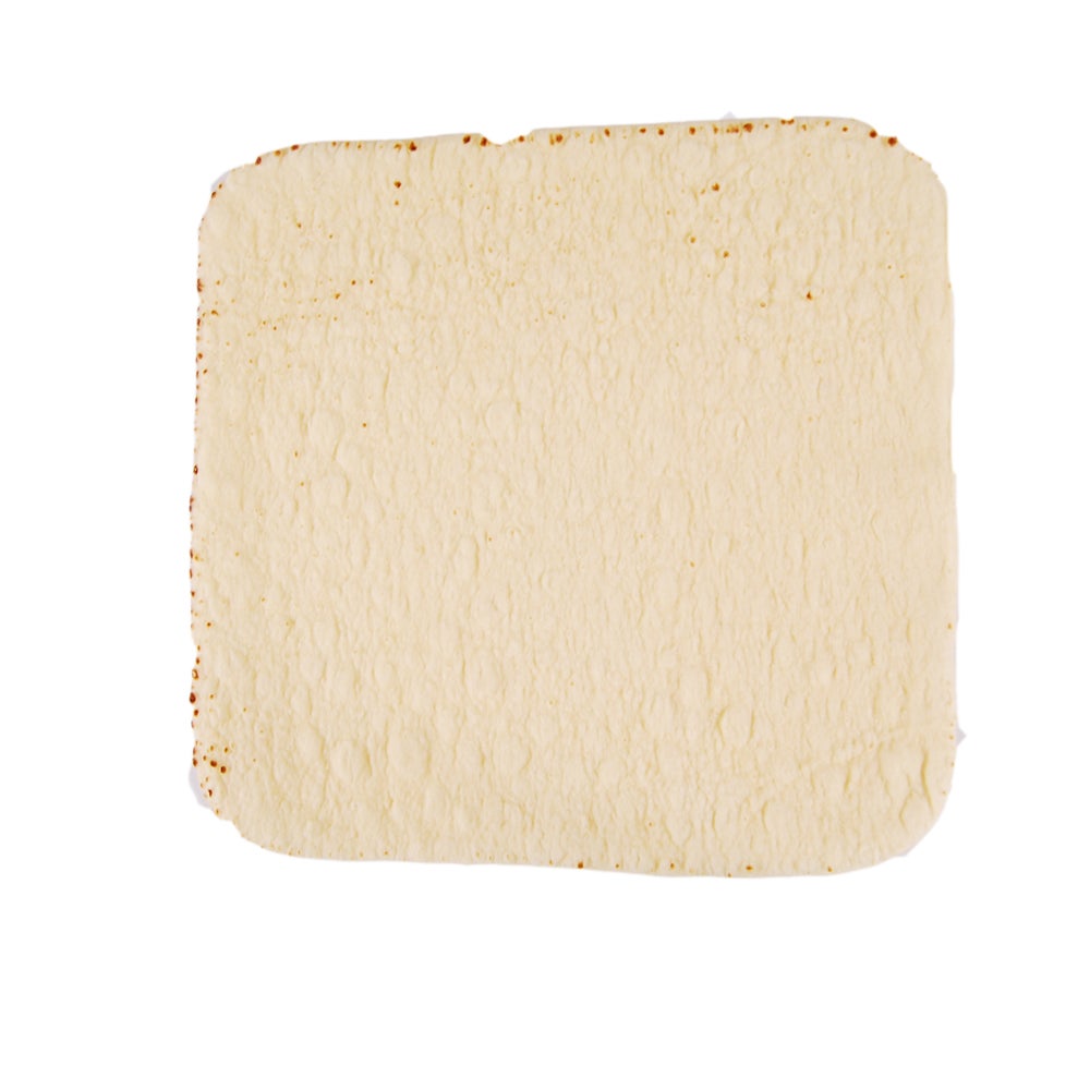 This 12 inch square thin, par-baked flatbread can be used for wraps, melts, crispy appetizers, and pizzas. It has raised toasted bubbles on top with medium brown grill marks on the bottom for an authentic appearance.