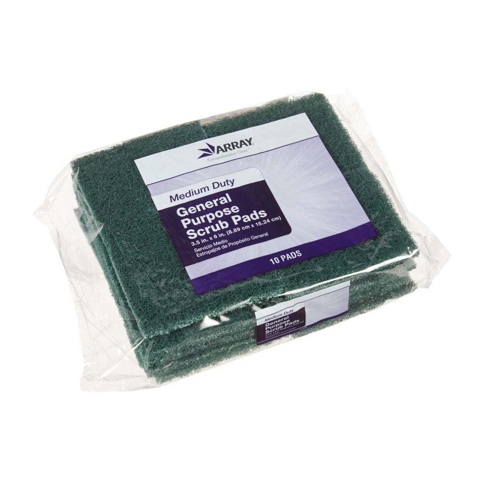 - These Array scrub pads are made of 100 percent nylon. The nylon construction makes them rugged and ready for medium-duty cleaning. This is a medium abrasive construction to be used for general purpose cleaning. They are green in color.