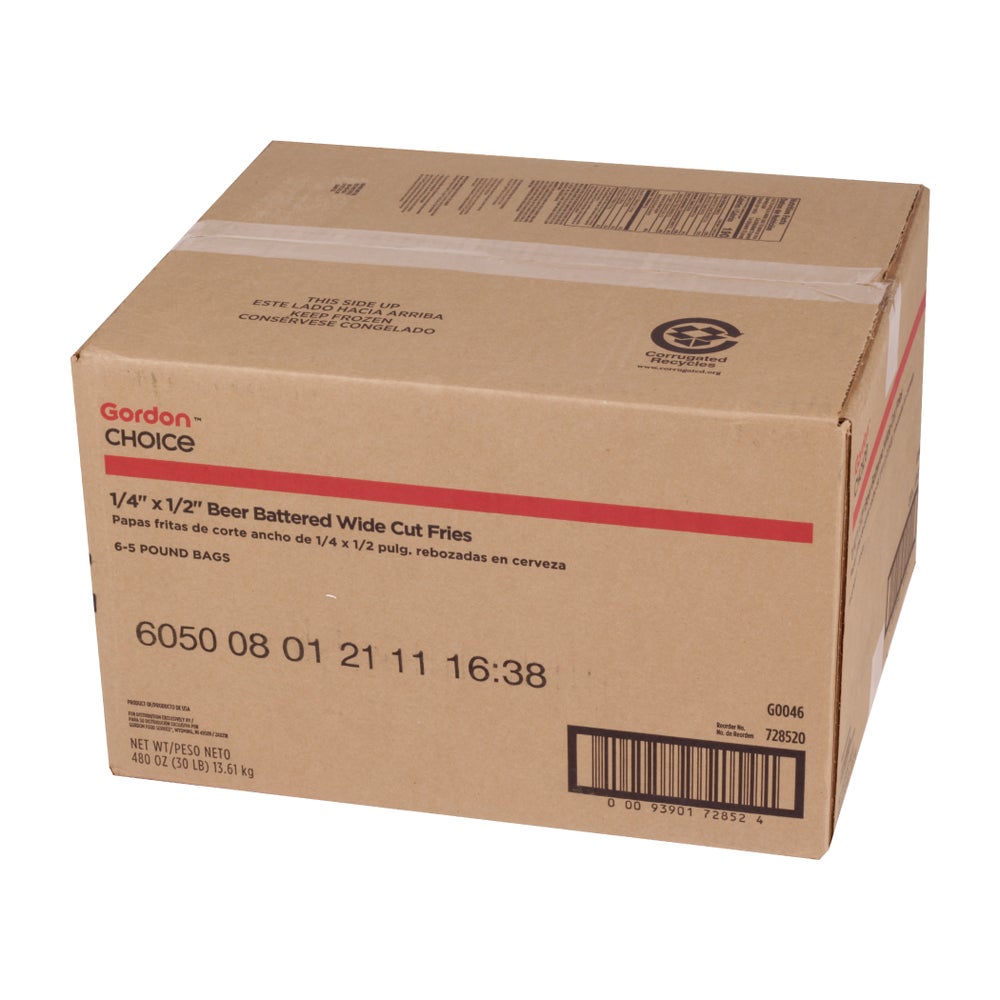 Gordon Choice 1/4 x 1/2 Inch Platter Cut French Fries, Beer Battered, Skin-On, Bakeable, Frozen, 5 Lb Bag, 6/Case
