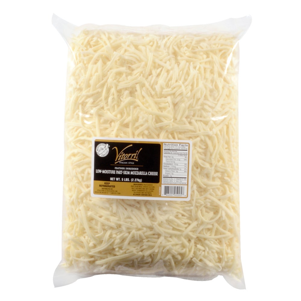 This low moisture part skim mozzarella cheese is made from pasteurized milk, cheese culture, salt, and enzymes. Brand may vary.