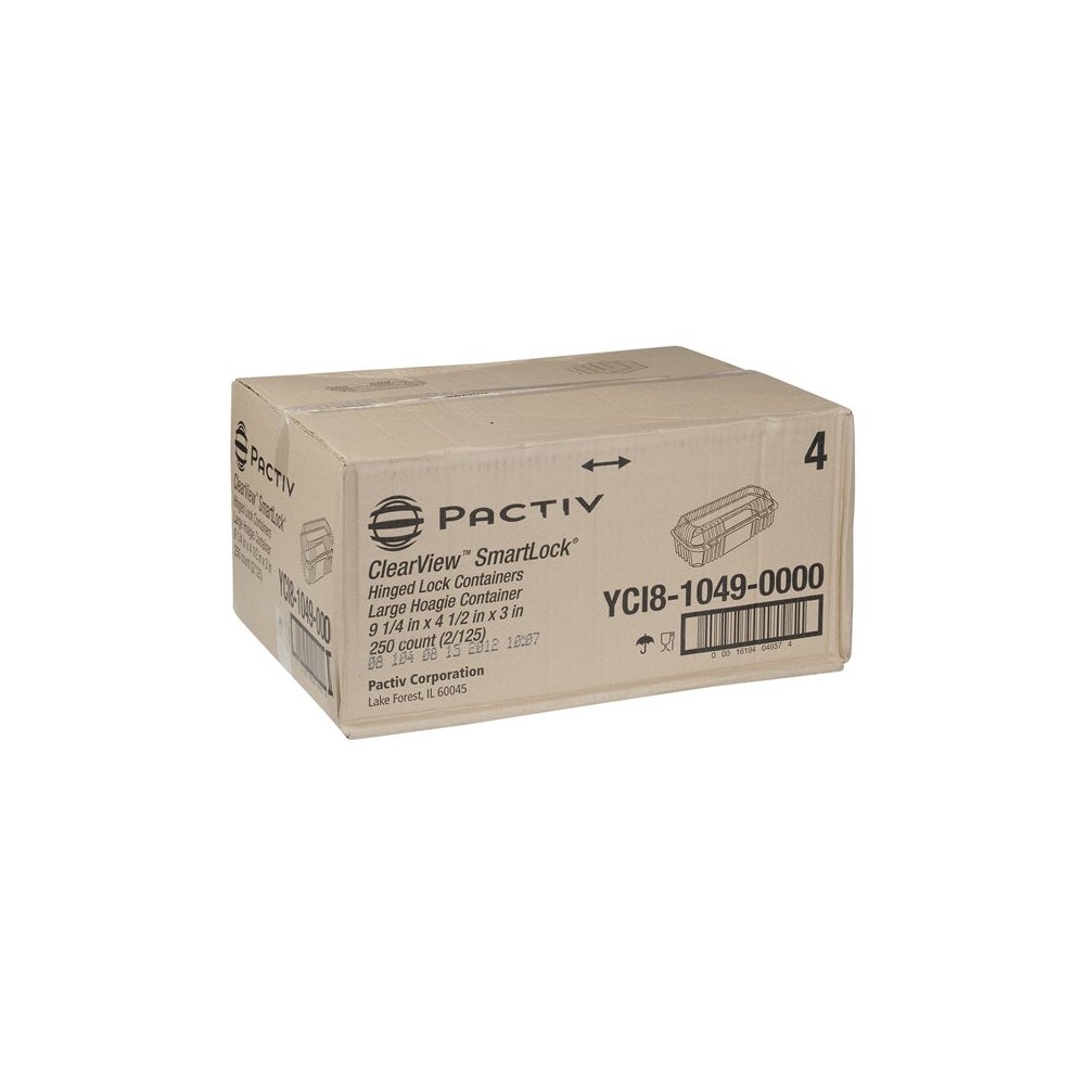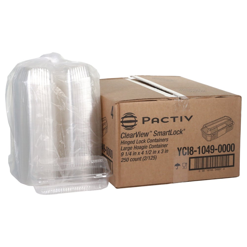 Pactiv 9.25 x 4.5 x 3 Inch Plastic Hoagie Containers, Clear, Hinged, Polystyrene, 125 Ct Bag, 2/Case
