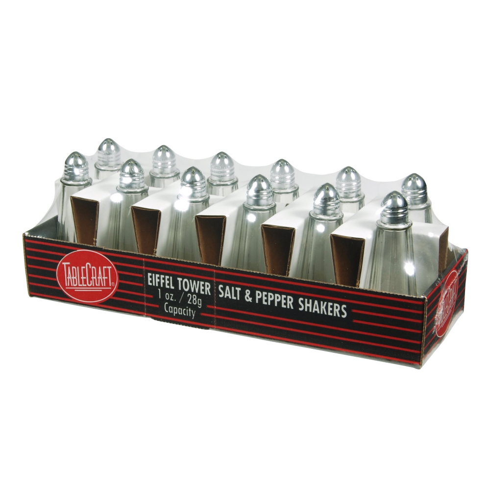 Shakers, Salt & Pepper, 1 Ounce, Eiffel Tower, Clear, Glass with Chrome-Plated Metal Tops, 12 Ct Package