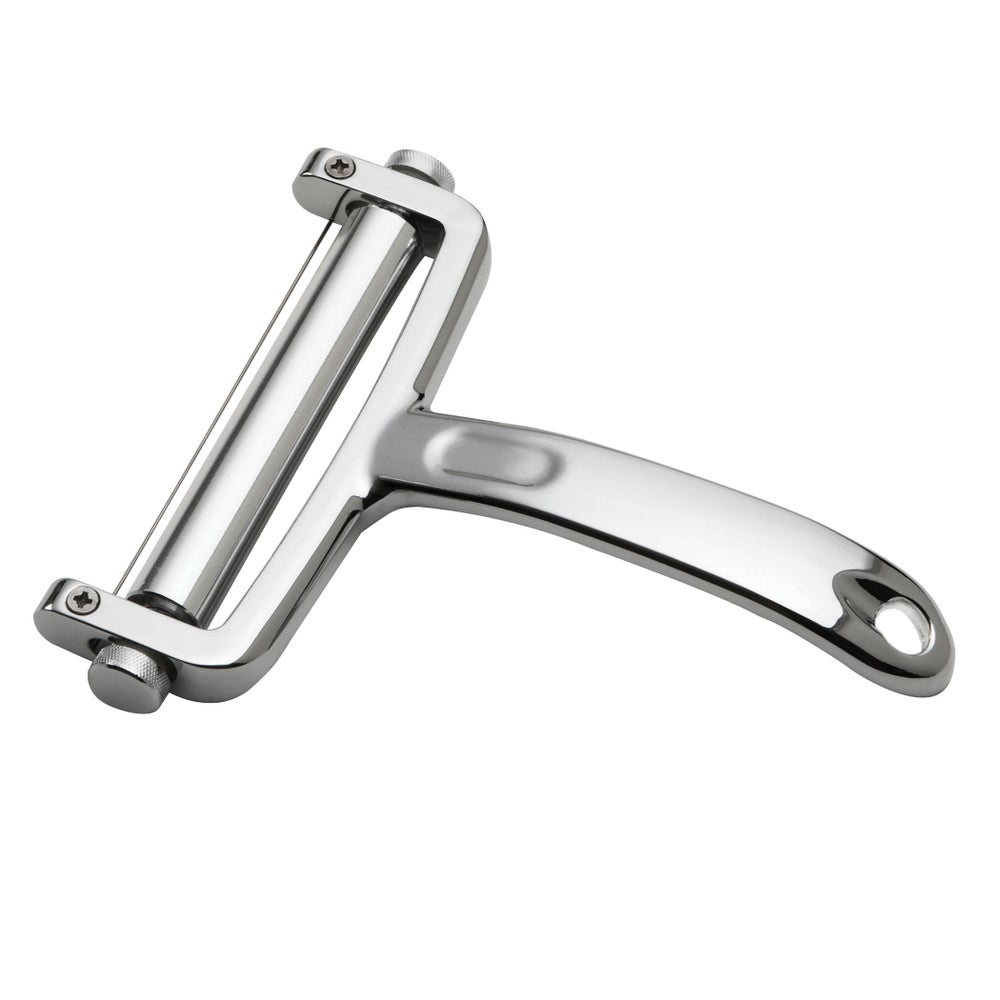 This cheese slicer consists of an adjustable stainless steel wire which can easily slice through a brick of cheese yielding consistent results. It is constructed of chrome-plated metal.