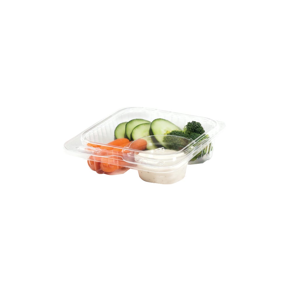 These Par-Pak brand of plastic 2-compartment hinged containers are 5.25 x 5.75 x 1.5 Inches. The shallow, 2-pocket styling allows for dipping sauce or side dishes and can be used with hot or cold foods.
