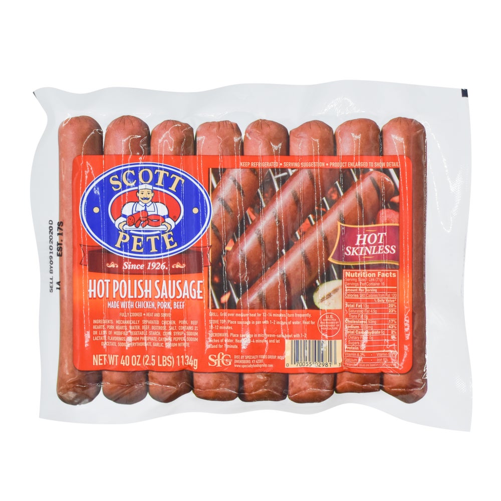 Scott Pete Hot Skinless Pork, Chicken & Beef Polish Sausage, 2.5 Lb Package, 10/Case