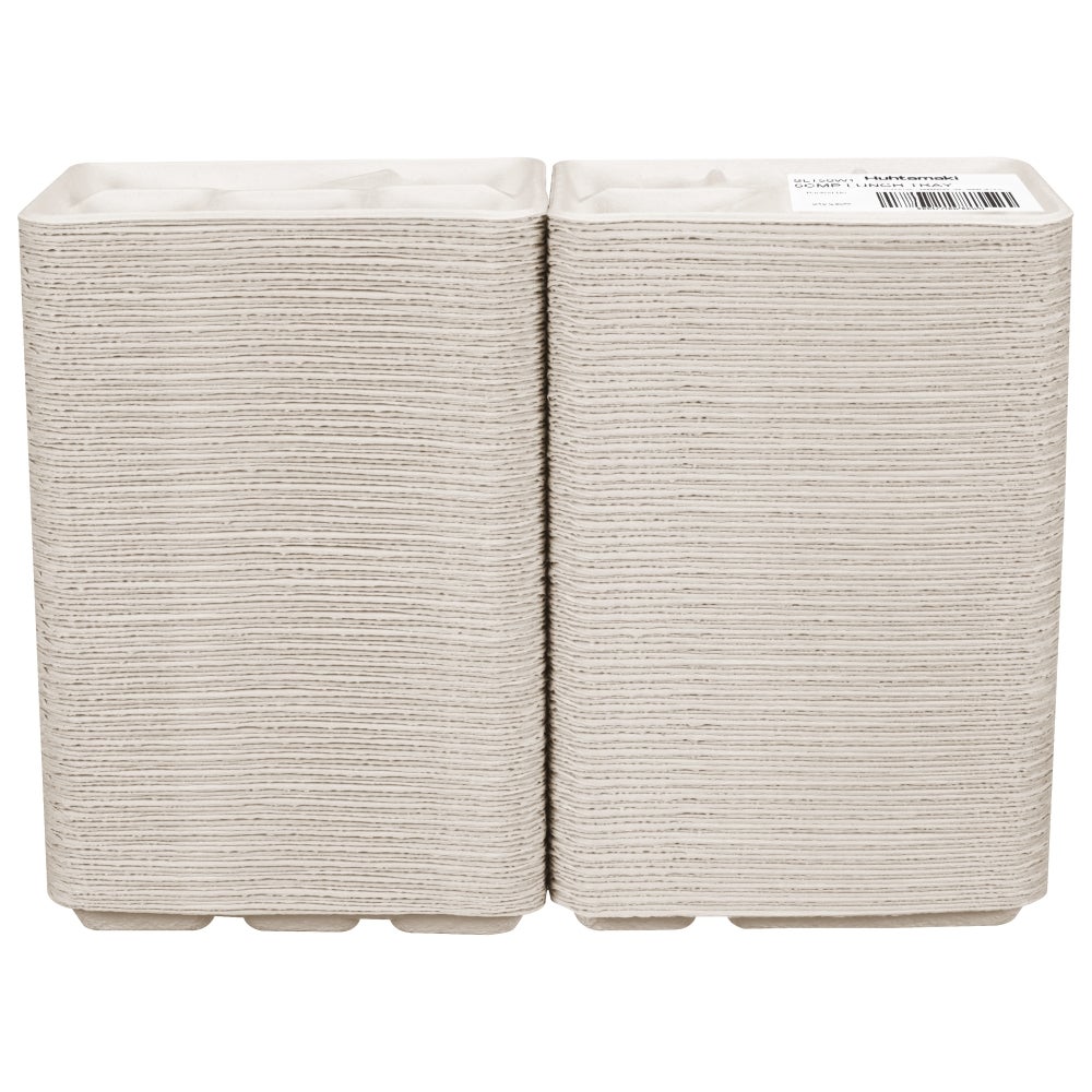 These Savaday brand of cafeteria trays are 8.25 x 10-inch in size and made of a biodegradable, molded fiber. The trays feature 5-compartments and have a traditional rectangular shape. The materials are 100% recycled material and 100% compostable.