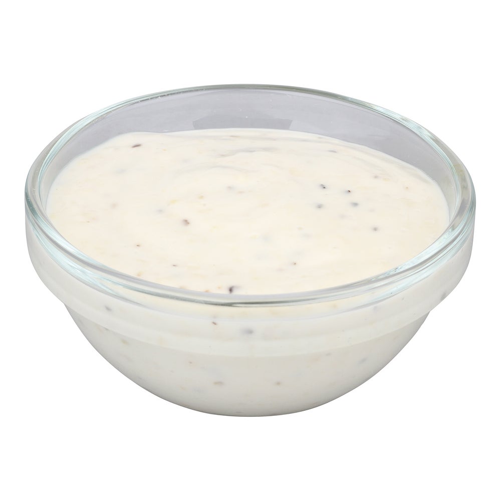 This traditional Caesar dressing features mild garlic and anchovy notes, ideal for a variety of applications. Made without a mayonnaise base, this tan-colored dressing retains a thin, creamy appearance with visible cracked black pepper. This dressing comes in an easy-to-use, no-mess container which reduces contamination risk and increases convenience, making it ideal for use on salad bars.