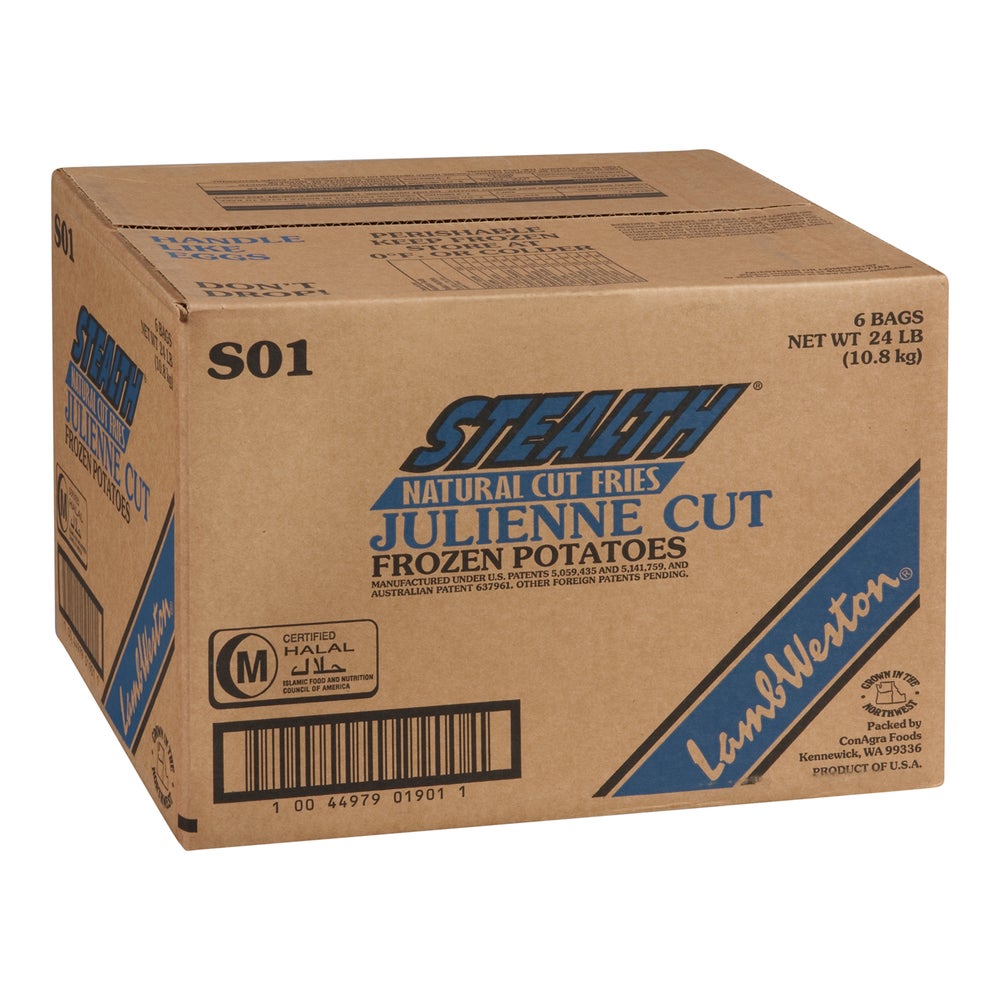 Stealth Fries 3/16 Inch Extra Long Fancy Julienne Cut French Fries, Coated, Skin-On, Bakeable, Frozen, 4 Lb Package, 6/Case