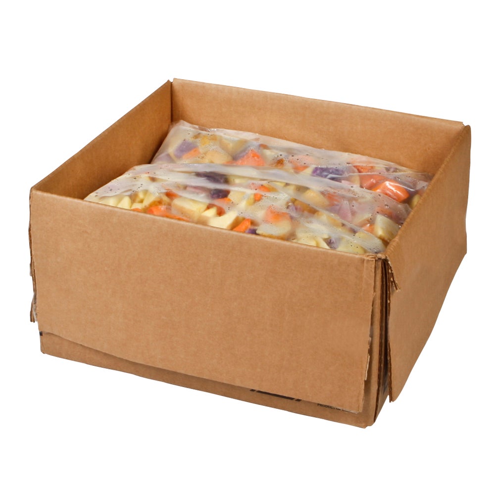 A colorful mix of purple majestic, yukon gold potatoes, and mountain rose heirloom sweet potatoes are oven-roasted with a touch of canola oil and light seasoning.