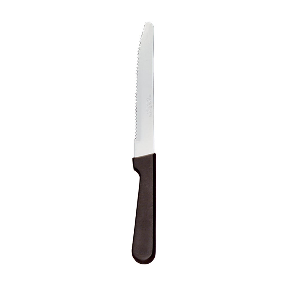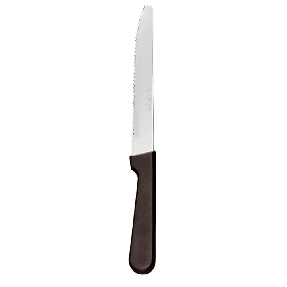 These steak knives have black plastic handles and round tips. They are a versatile utility item that is ideal for high volume kitchens.