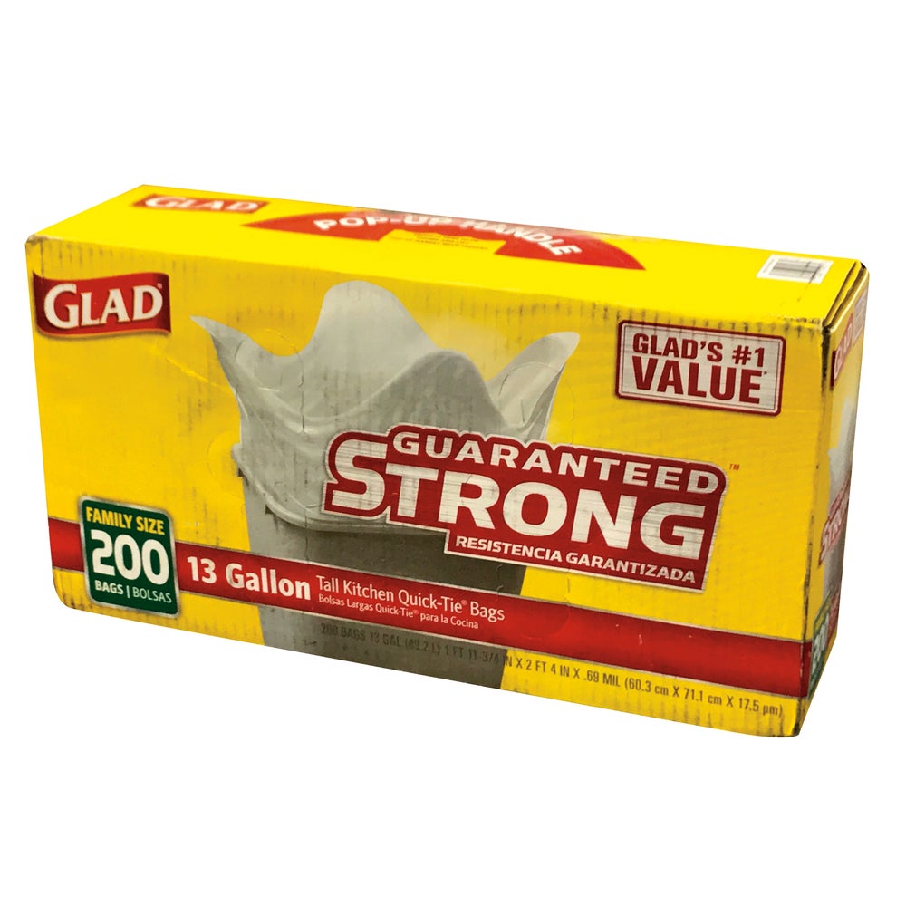 Glad 13 Gallon White Can Liners, Quick Tie, 200 Ct Box, 1/Case