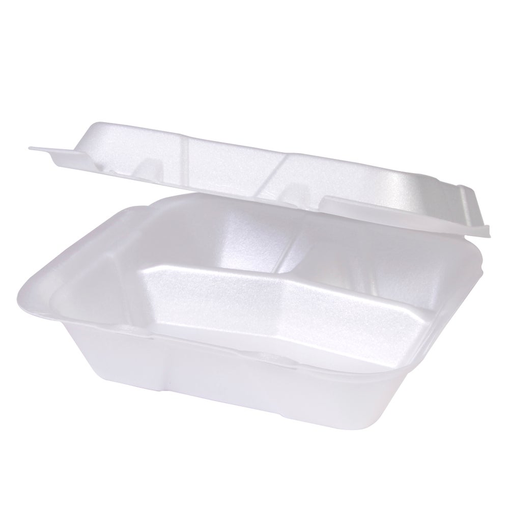 Packer Label 9 x 9 Inch Foam 3-Compartment Containers, White, Hinged, Polystyrene, 100 Ct Bag, 2/Case