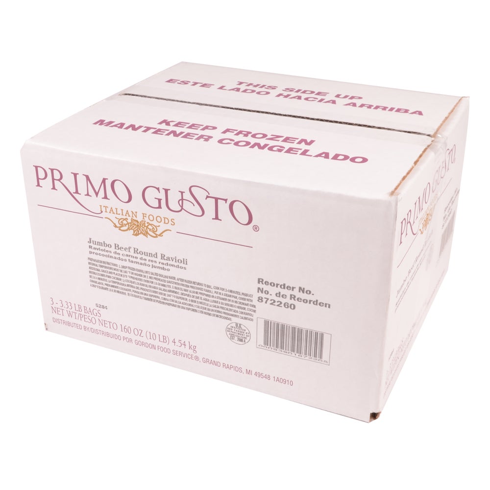 Pasta, Round Ravioli, Jumbo, Beef, Cooked, Frozen, 3.33 Lb Bag, 3 Per Case