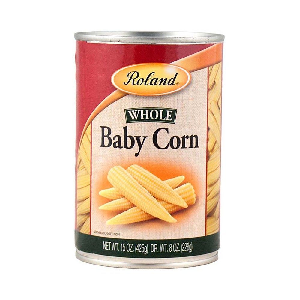 - As a canned product, Roland Whole Baby Corn is used in hot dishes or eaten right from the tin. Baby corn is used whole although some Asian end-users will slice the product parallel to the long axis to obtain a lower portion cost.