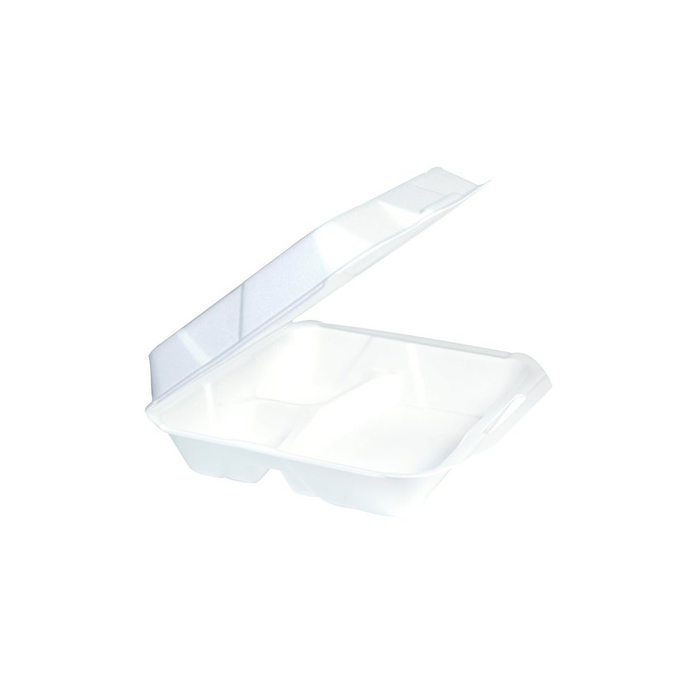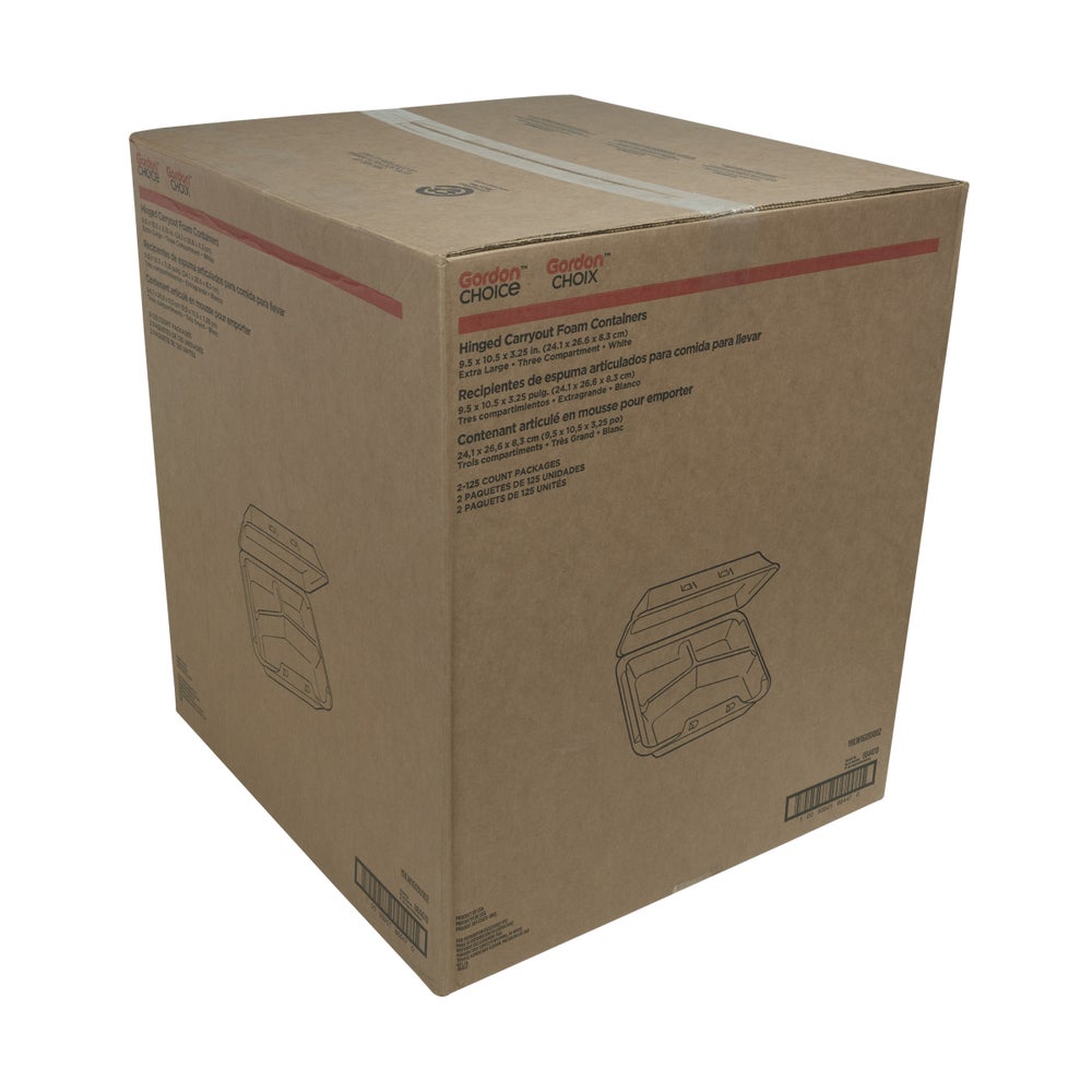 Gordon Choice X-Large 9.5 x 10.5 x 3.25 Inch Foam 3-Compartment Containers, White, Hinged, Polystyrene, 125 Ct Package, 2/Case