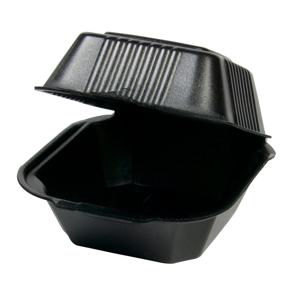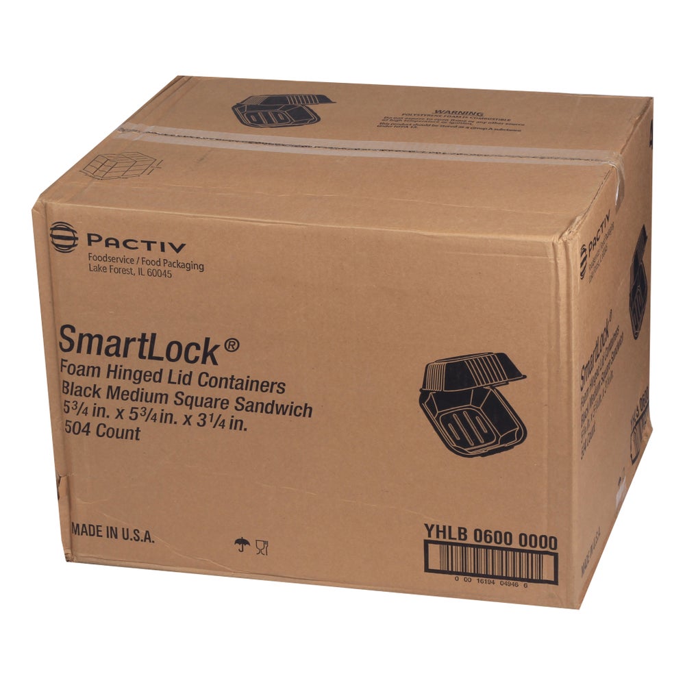 Pactiv Medium 6 x 6 x 3.25 Inch Foam Sandwich Containers, Black, Hinged, Polystyrene, 84 Ct Package, 6/Case