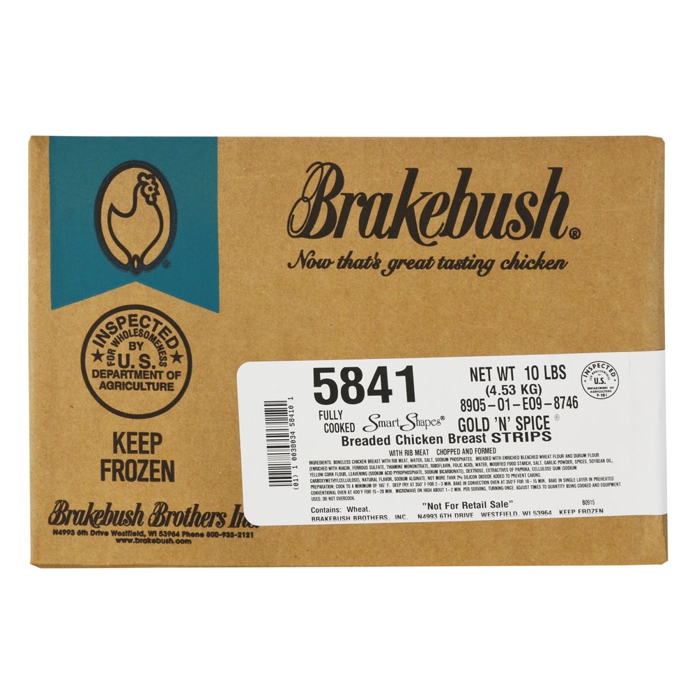 Brakebush Gold'n Spice Breaded Chicken Breast Strips, Portioned, Cooked, Individually Quick Frozen, 5 Lb Bag, 2/Case