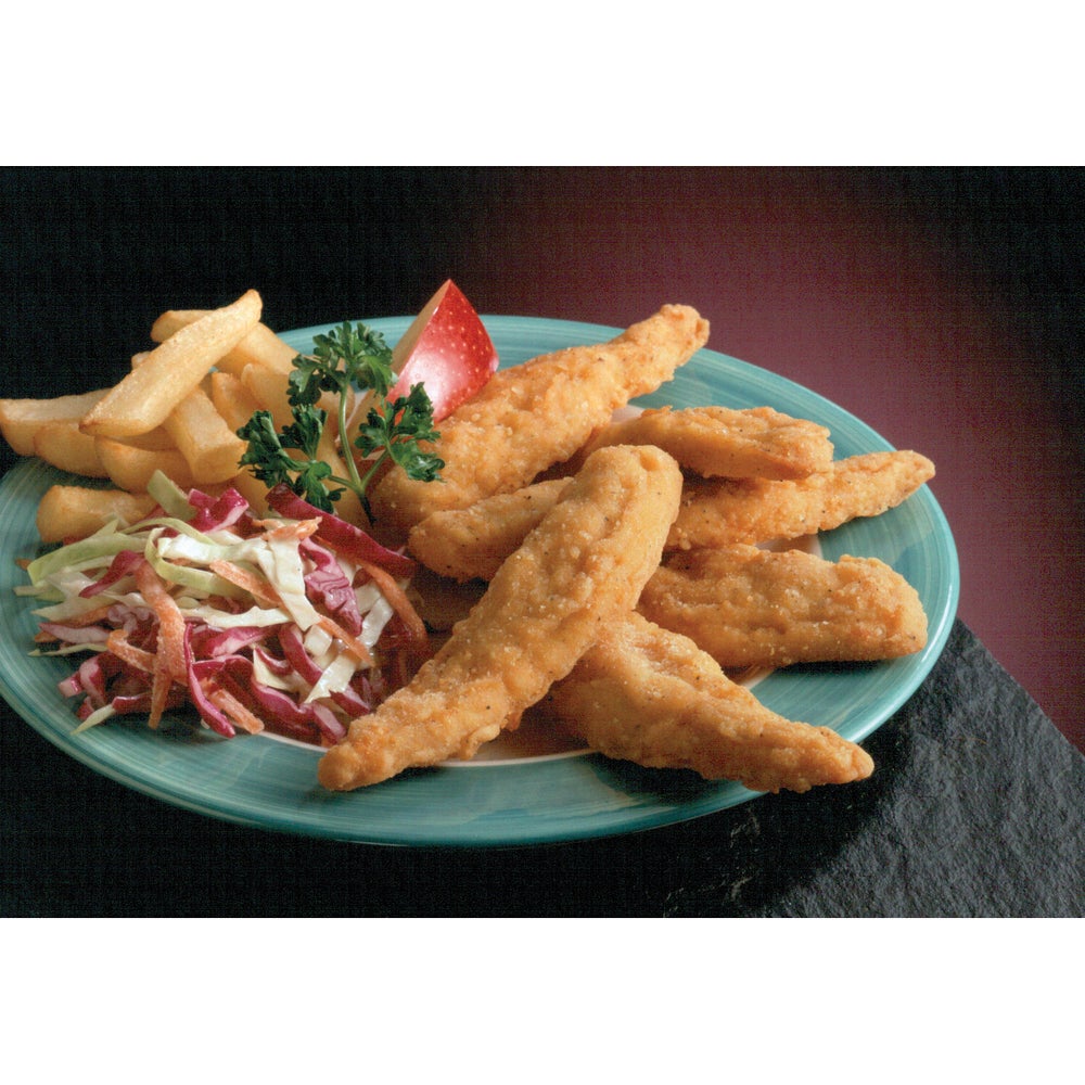 These chicken strips come in unique shapes and are lightly breaded.