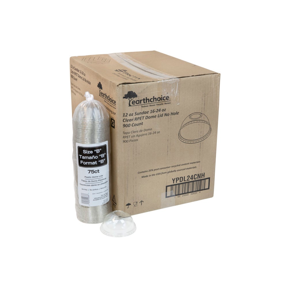 Earthchoice No-Hole Plastic Lids, Clear, RPET, for 12-24 Ounce Cups, 75 Ct Package, 12/Case