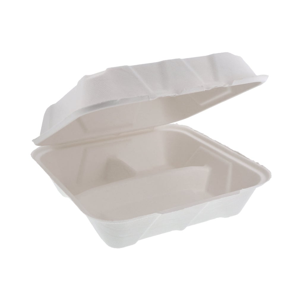 These molded fiber containers are processed chlorine-free to create an all-natural white appearance. The blend of sustainable, renewable fiber, and pulp materials reflects a commitment to the environment and sustainable products. Features a double-tab closure.