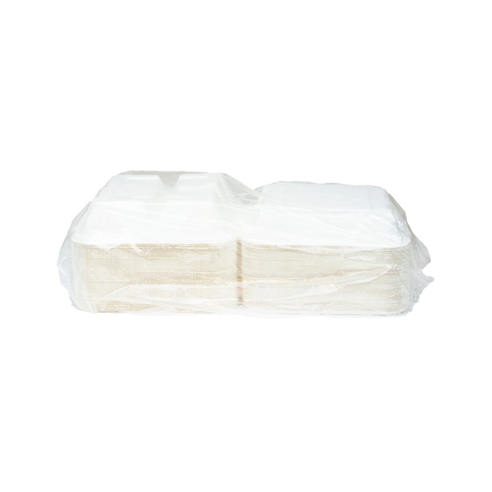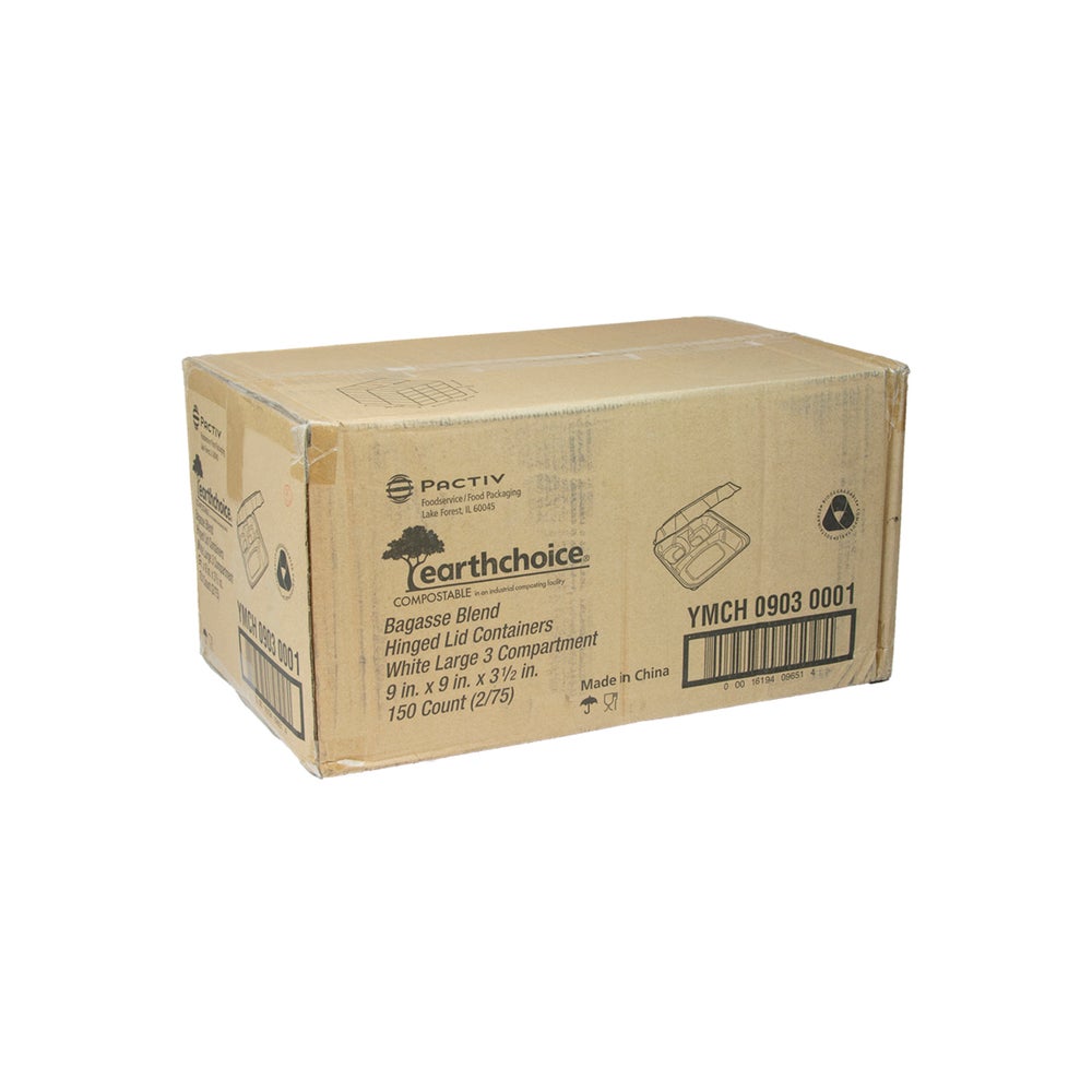 Earthchoice Large 9 x 9 x 3.5 Inch Molded Fiber 3-Compartment Containers, Natural White, Hinged, 75 Ct Package, 2/Case