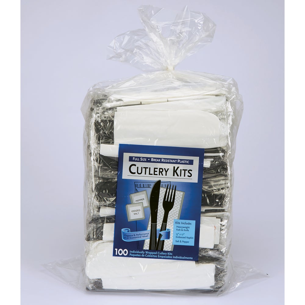 Juegos de cubiertos de plástico pesado para tenedor y cuchillo, negro, con servilleta/sal/pimienta, polipropileno, 100 Cdd Bol, 4/Caj