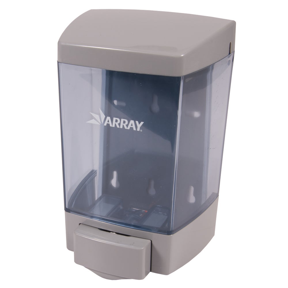 - El dispensador tiene una tapa única, resistente al agua y un diseño curvado para mayor higiene. El tanque es gris.