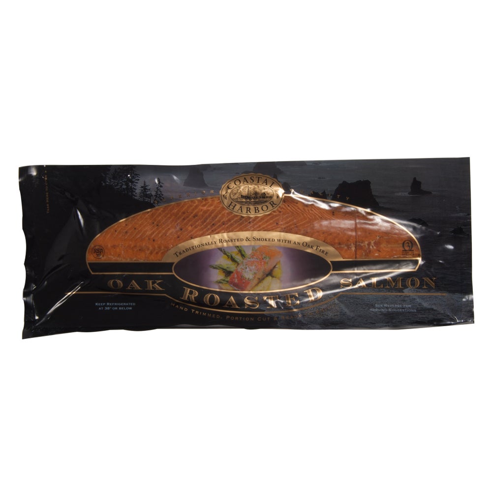 Lados de salmón ahumados en caliente de cedro y roble, criados en granja, con piel, seccionados, de 2-2,5 libras, cocidos, congelados, 3 libras por envase., 3 Plb Cda, 2/Cjs